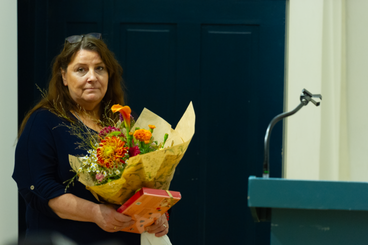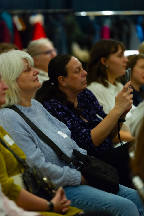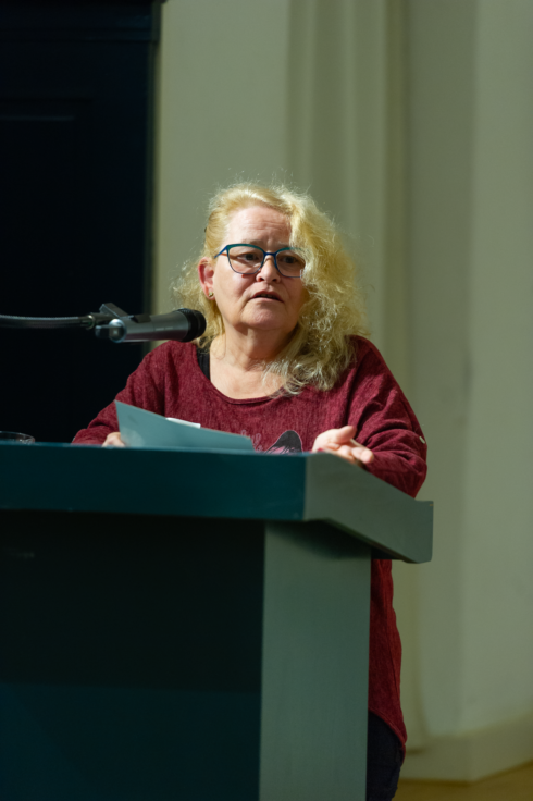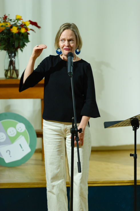 Ein besonderer Moment des Abends war die Perspektive der Lerner-Expertin Rita Grunow. Lerner-Expertin Tina Fidan verlas ihren Text – und machte deutlich, dass Schwierigkeiten beim Lesen, Schreiben und Rechnen für sie in der Vergangenheit mit Ausgrenzung verbunden waren: „Ich konnte ein wenig schreiben, lesen und rechnen. Ich wurde ausgegrenzt aus der Klasse, rausgeschickt und seelisch niedergedrückt.“