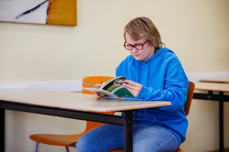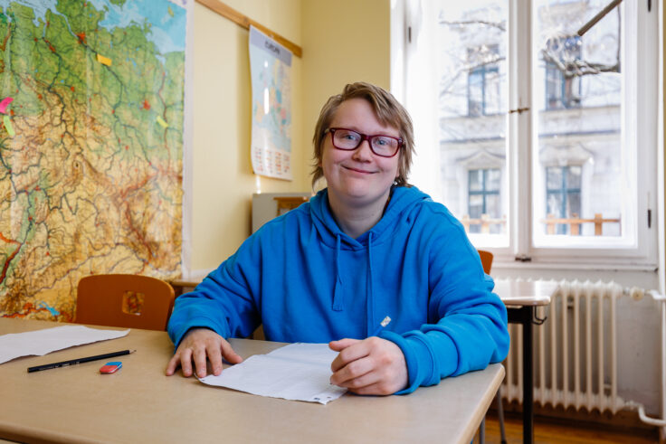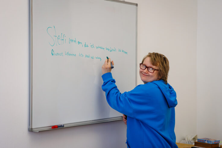 Am Anfang war das Lernen für mich ungewohnt und neu. Ich war unsicher. Geholfen hat mir, dass bei „Lesen und Schreiben“ alle so verständnisvoll sind. Die Lehrer und Lehrerinnen nehmen viel Rücksicht auf uns Schüler. Und auch die Lernenden helfen sich hier gegenseitig. Es ist nicht immer leicht, dranzubleiben, aber ich versuche, nicht aufzugeben, auch wenn ich etwas mehr Zeit brauche. Was mir hilft: Sachen aufschreiben. Das ist bei vielen anderen Schülern anders, aber mir hilft das Aufschreiben. Dann kann ich sie mir besser merken. Auch Bilder helfen mir, etwas zu verstehen oder mich zu erinnern.