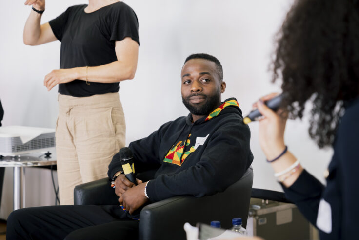 In der anschließenden Podiumsdiskussion mit dem Titel „Sichtbar, gleichberechtigt, mittendrin. Wie kommen wir dahin?“ tauschten sich Max Landero (Staatssekretär Integration, Antidiskriminierung und Vielfalt), Andrews Mensah (Stand-Up-Comedian und Lerner), Anke Nöcker (Abteilungsleiterin Sportentwicklung im LandesSportBund Berlin) und Sabine Werth (Vorsitzende der Berliner Tafel e. V.) über Wege zu echter Teilhabe aus.